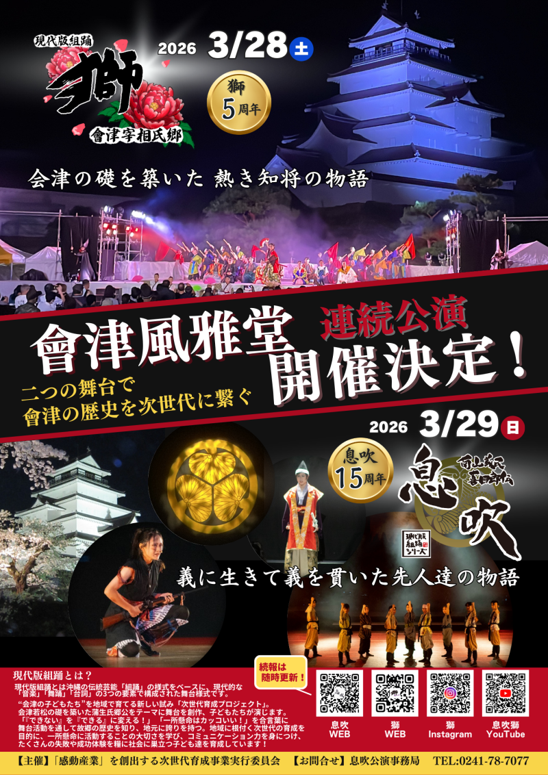 そうした思いを体現するために、2026年3月に現代版組踊「獅Leon~會津宰相氏郷」「息吹~南山義民喜四郎伝」の2つの歴史舞台に挑みます。