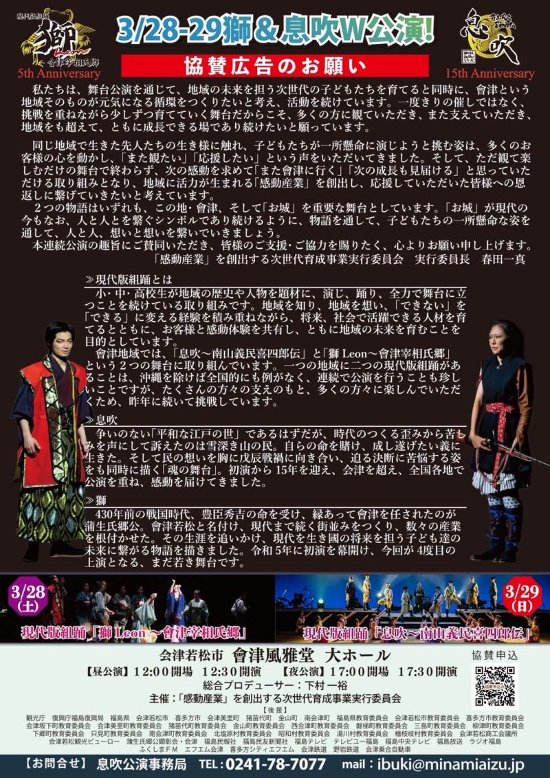 福島県内だけでなく、県外からも多くの皆さまからご協賛を頂戴し、前代未聞の現代版組踊「獅Leon~會津宰相氏郷」「息吹~南山義民喜四郎伝」のW公演を成功させることができました!心より御礼申し上げます。