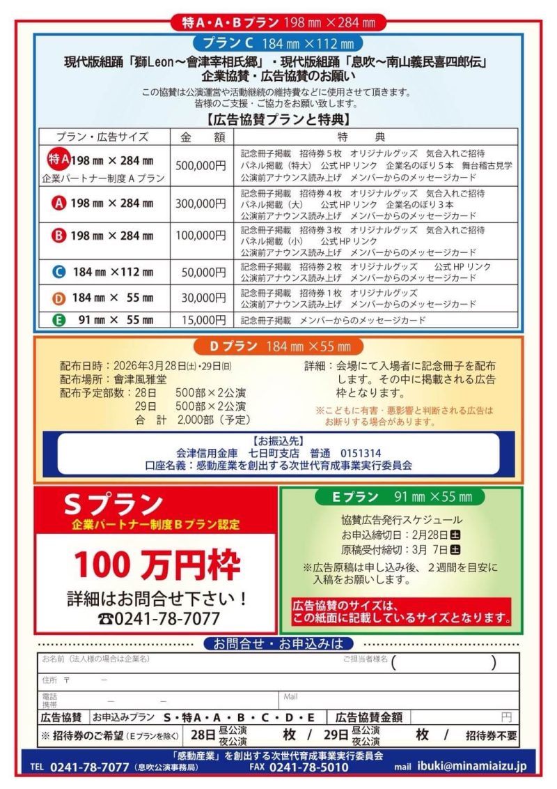 2026年3月28日・29日 獅・息吹連続公演協賛のお願い